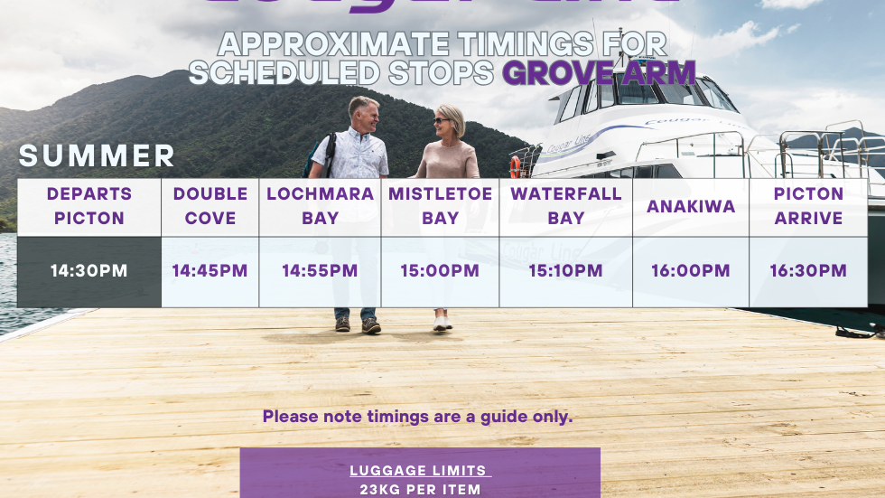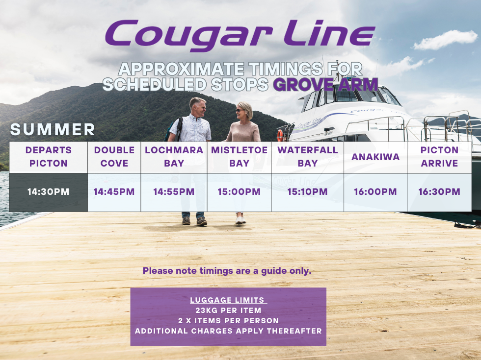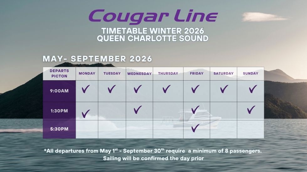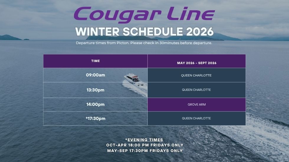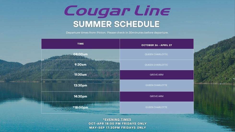 See Cougar Line’s daily schedule to plan and book your water transfer or scenic cruise from Picton to Queen Charlotte Sound/Tōtaranui or Grove Arm.